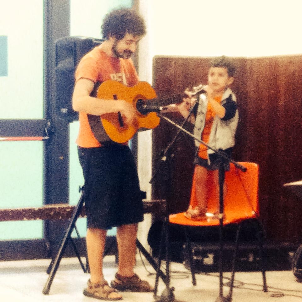 Dopo l’introduzione toscana abbiamo fatto una pausa per il buffet dopodiché siamo tornati alla riscossa io e Francesco con il duo Irish Tovarish proponendo brani irlandesi. Si sono uniti in successione all’atmosfera irlandese anche Giulio Putti al Bodhràn (il tamburo a cornice irlandese) e Stephanie Martin al violino. Più tardi abbiamo aggiunto la tradizione scozzese grazie alla violinista di Aberdeen Natalie Marie Murray. Avrei tanto voluto far esibire anche l’ottimo Sergio Trotta, che però si è prodigato come fonico affinché il suono nella sala fosse gradevole, in compenso però è riuscito a far esibire il figlioletto Antonio in una memorabile “Generale” di De Gregori, accompagnandolo alla chitarra classica!